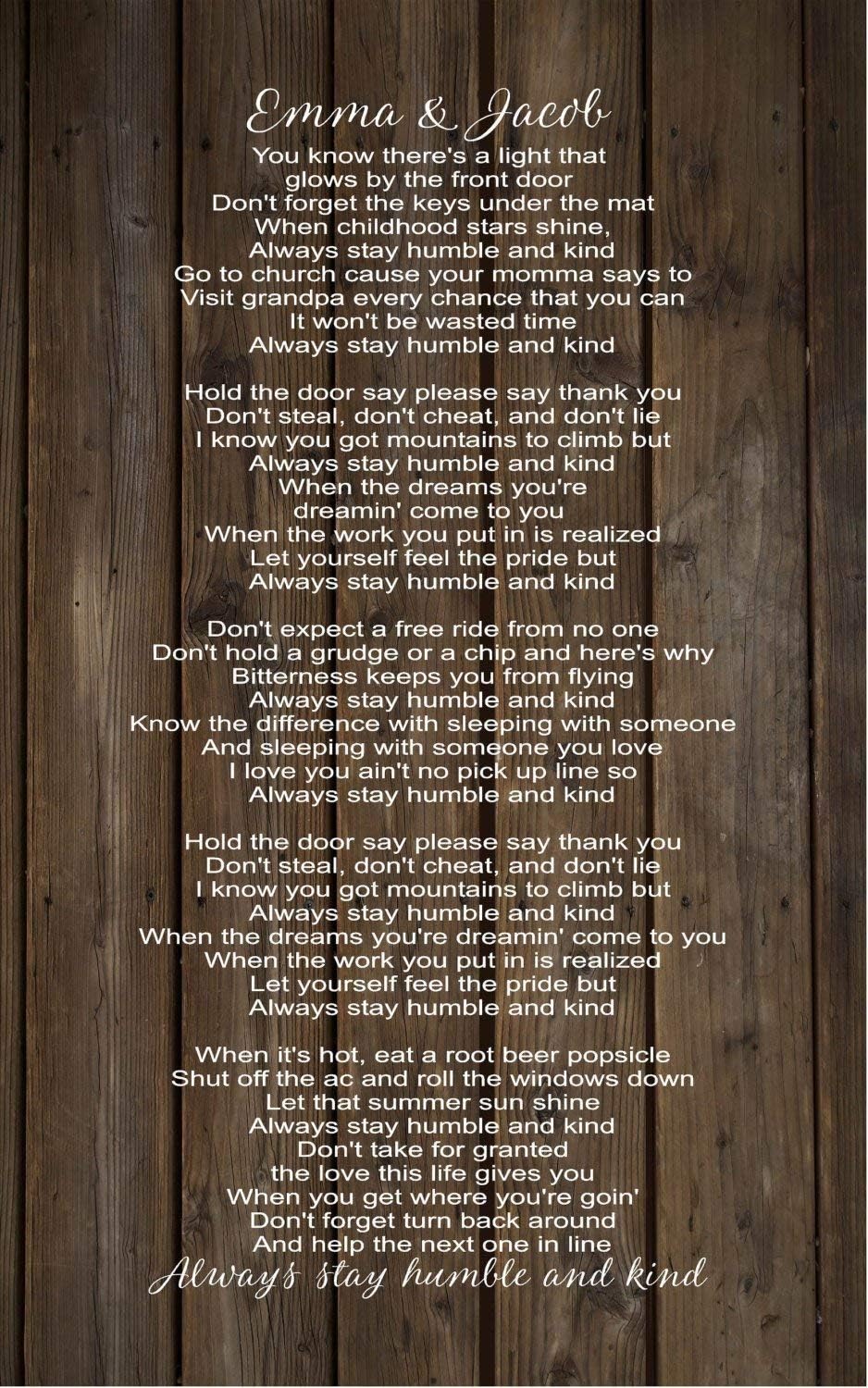 I know you got mountains to climb but. You know theres a light that glows by the front door Dont forget the keys under the mat When childhood stars shine Always stay humble and kind Go to church cause your mamma says to Visit grandpa every chance that you can It wont be wasted time Always stay humble and kind Hold the door say please say thank you Dont steal dont cheat and dont lie I know you got mountains to. Always stay humble and kind.
